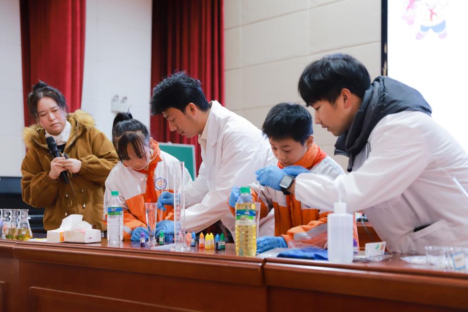 随后的实验环节,教室变成了充满惊喜的“魔法课堂”。青年博士教师与学生志愿者带领孩子们亲手操作:溶液在瓶中悄然变绿、转红、化黄,如同一盏自动切换的微型信号灯;色素滴入油中,缓缓下沉成一场静谧的“彩虹雨”;荧光在试管中温柔亮起,如同黑暗中点亮的科学之光;泡腾片投入水中,瞬间上演“杯中火山”的喷发奇观……孩子们聚精会神地看着一个个有趣的化学现场,眼神亮晶晶的,笑声、惊叹声、提问声此起彼伏。师生志愿者俯身引导、耐心讲解,在互动中传递知识,在动手中激发兴趣。