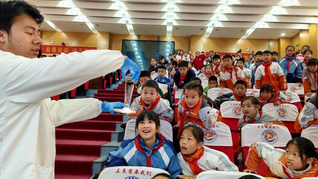 本网讯12月30日,信丰县思源实验学校教学楼里洋溢着不同于往日的热闹与期待。全国高校“双带头人”教师党支部书记“强国行”专项行动团队、江西理工大学化学化工学院应化党支部(功能晶态材料化学江西省重点实验室)的党员师生走进校园,为这里的孩子们带来一场别开生面的“化学魔法秀”。